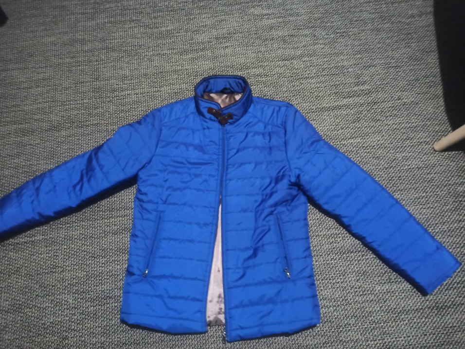 Kiğılı Fermuarlı cep ve yüksek yakalı, parlak mavi renkte, uzun kollu erkek ceketi.