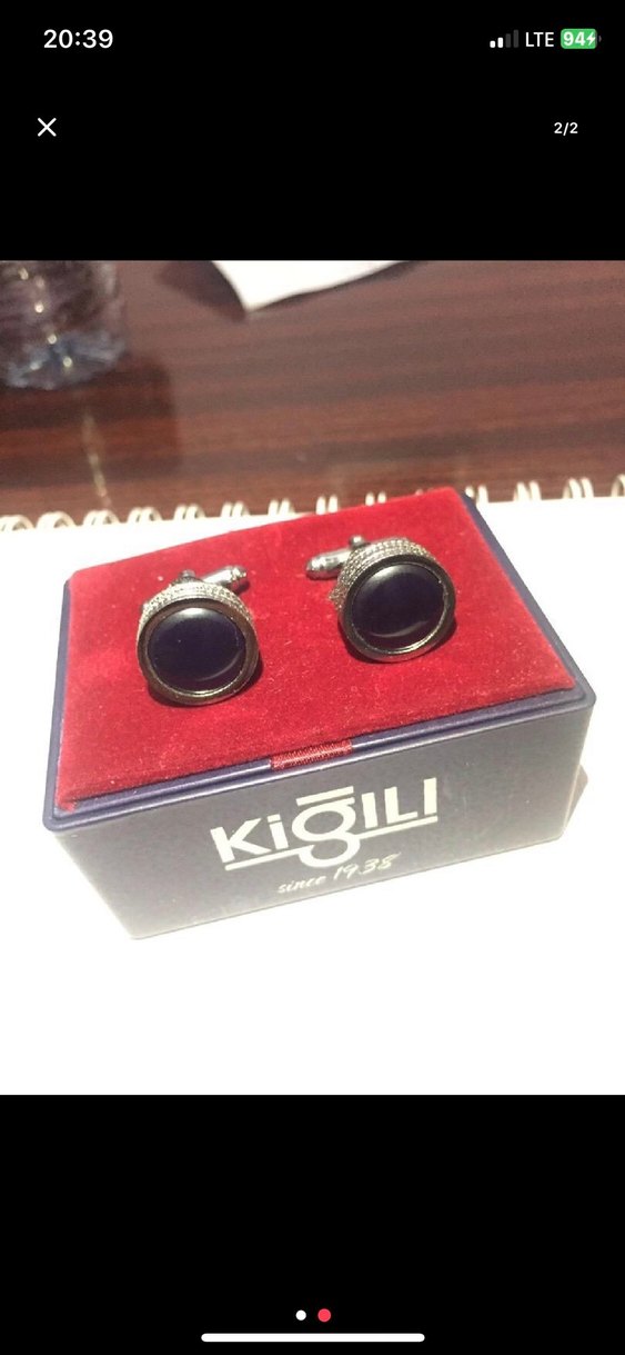 Kigili marka siyah gotik erkek kol düğmeleri, klasik yuvarlak tasarımda, şık kutusunda sunulmaktadır.