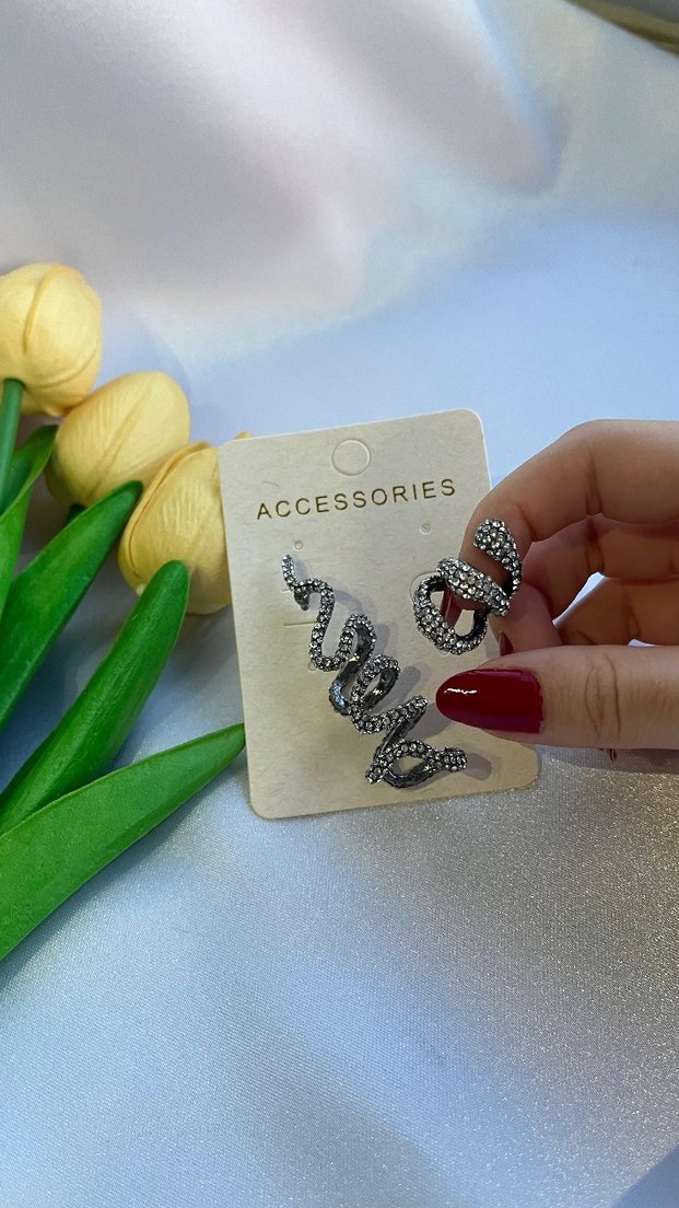 Kısa boylu, yılan desenli ve pul detaylı gri küpeler, rock punk tarzına uygun. Günlük kullanıma şık bir ışıltı katıyor.
