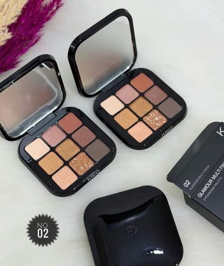 İthal üründür Kiko 02 numara göz farı paleti, mat ve ışıltılı bej ile koyu tonlar içerir, çeşitli makyajlar için uygundur.