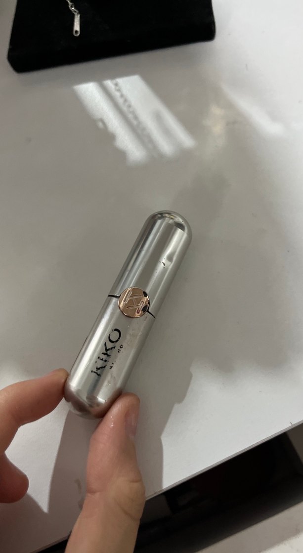Kiko markasına ait gri ve bej renkli, metalik görünümlü, rose altın detaylı ruj.