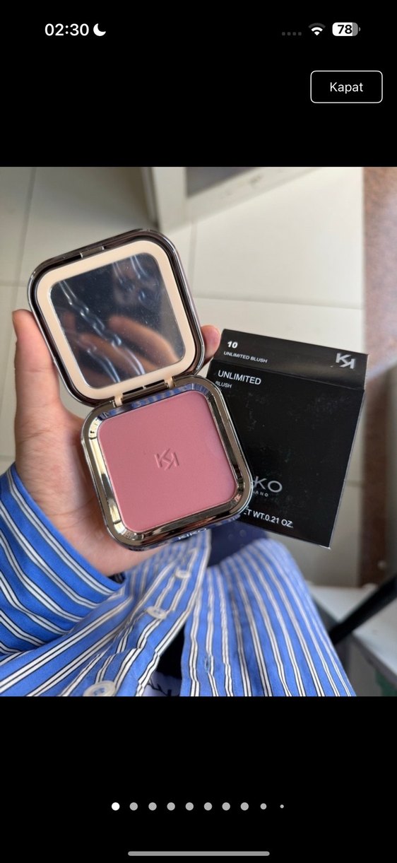 Pastel pembe renkte, ayna kapaklı kompakt kutuda sunulan allık. Renk adı "Unlimited" olarak belirtilmiştir.