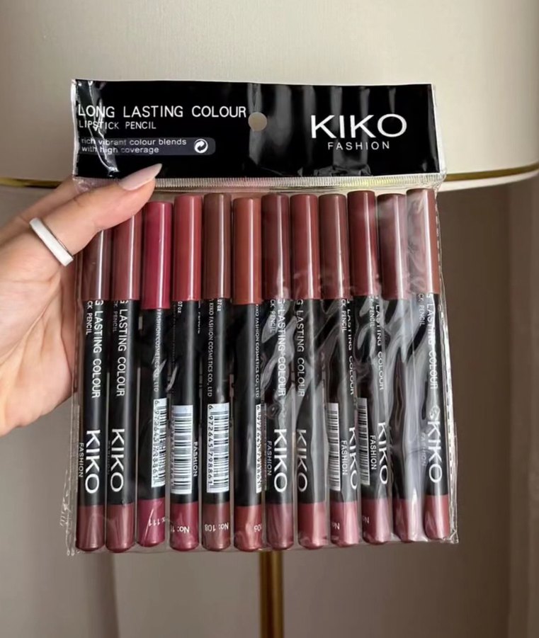 Kiko'nun 12'li koyu bej dudak kalemi seti, kalıcı renk ve hassas uygulama sağlar. Kullanışlı bir çanta ile birlikte gelir.
