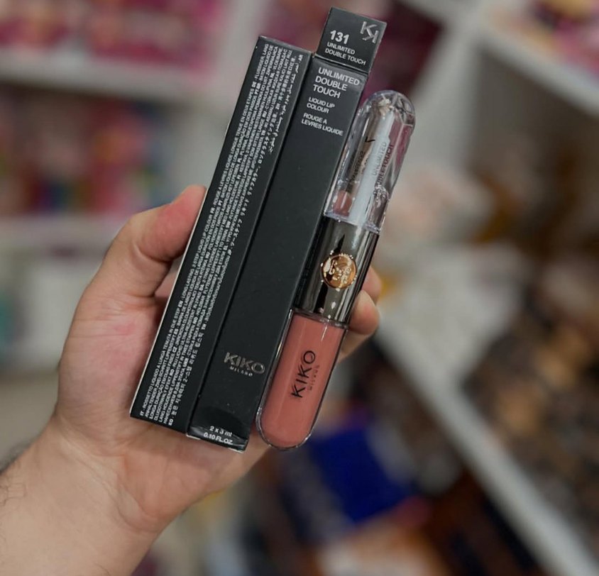 KIKO 131 Double Touch parlak bej renkli sıvı ruj, uzun süre kalıcı çift uçlu tasarıma sahiptir.