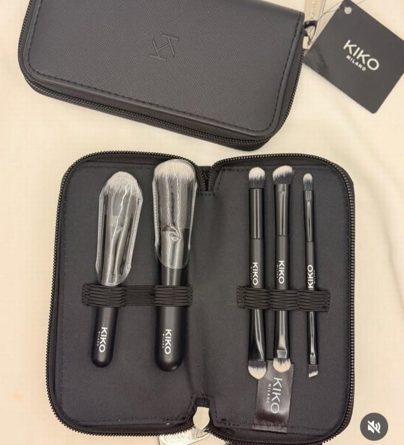 Kiko marka, fermuarlı çantada düzenlenmiş, koyu renk saplı ve bej tonlarında 6 parça makyaj fırçası seti. ️
