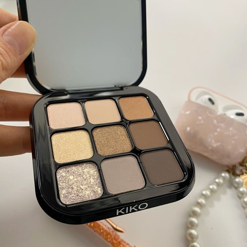 KIKO marka, mat ve ışıltılı dokularda bej ve kahverengi tonlarında dokuzlu göz farı paleti. İTHAL ÜRÜN