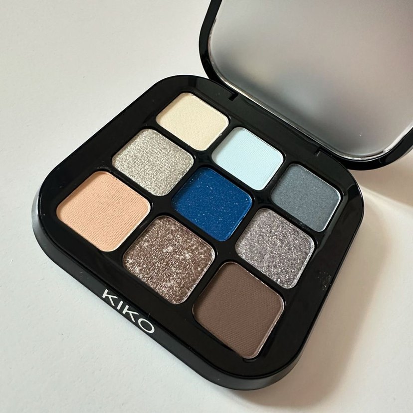 Kiko göz farı paleti, canlı koyu mavi, yumuşak nötr ve ışıltılı gümüş tonlarıyla dokuz renk içerir. İTHAL ÜRÜN