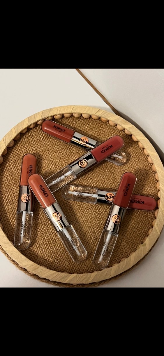 KIKO markalı açık kahverengi tonlarında, parlak bitişli rujlar. Şeffaf kapaklı, pürüzsüz uygulama ve canlı renk sunar.