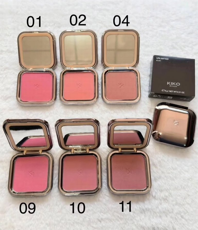KIKO allık i, her biri aynalı kompakt kutuda altı farklı açık pembe tonundan oluşur. Tonlar yumuşak şeftali ve derin gül arasında değişir.
