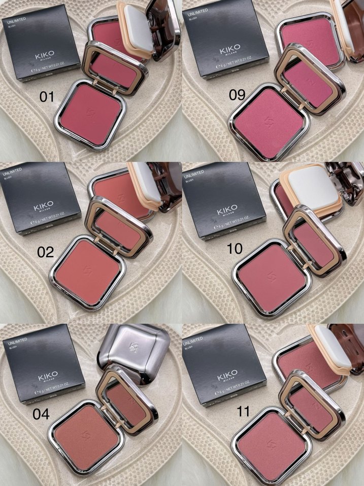 KIKO'nun 01, 02, 04, 09, 10 ve 11 numaralı pembe tonlarında, aynalı kompakt kutuda çeşitli pudra seçenekleri.