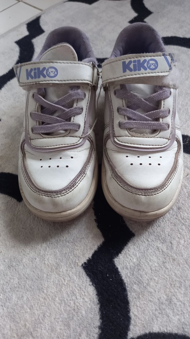 Beyaz, gri bağcıklı ve cırt cırtlı kız çocuk spor ayakkabısı, kauçuk malzemeden, desen içermeyen sokak tarzı. Üzerinde 'KiKO' yazısı bulunur.