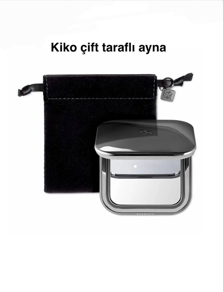 Kiko'dan siyah çift taraflı makyaj aynası, kompakt tasarıma ve koruyucu kese dahildir. Taşımak için uygundur.