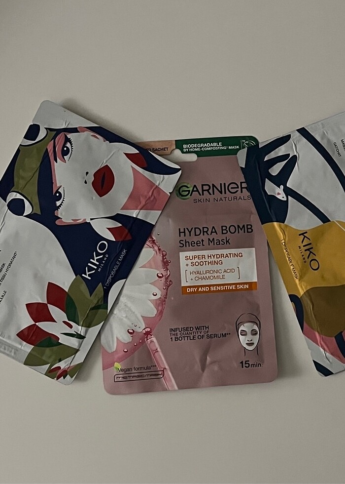 Yurt dışından Kiko kendi mağazasından aldım, iki adet Kiko bir adet Garnier toplam üç adet nemlendirici cilt maskesi, yeni ürün, iyi günlerde kullanılsın.