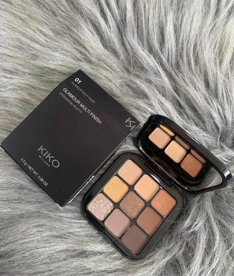 KIKO Çok Renkli Göz Farı Paleti, mat ve ışıltılı dokuda dokuz bej ve koyu ton içerir. Aynalı kompakt tasarım.