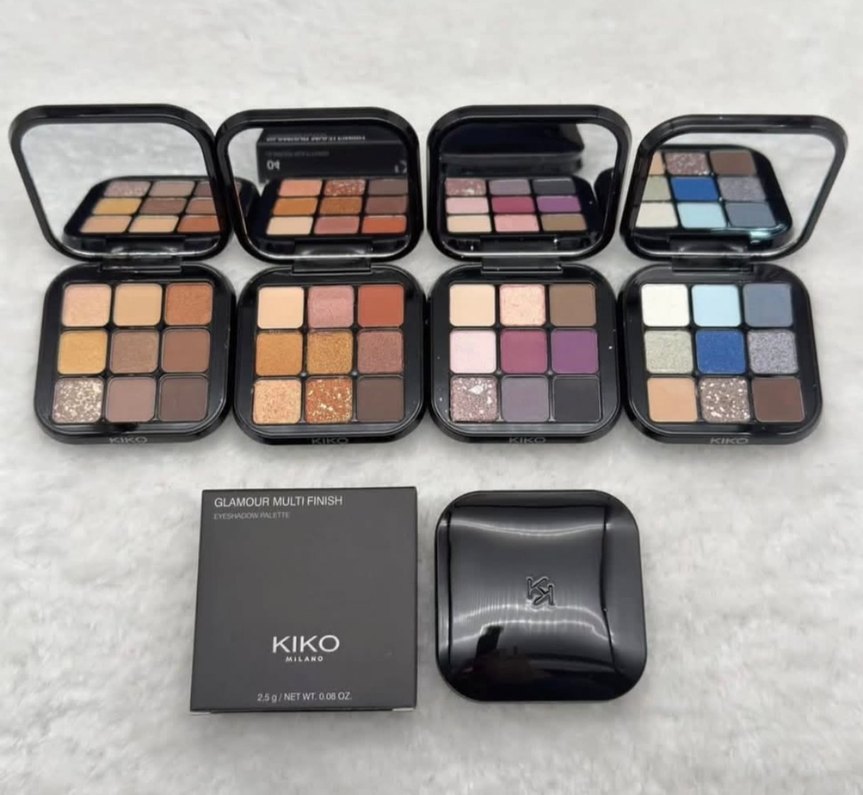 KIKO Glamour Multi Finish göz farı paleti, kompakt kutuda çeşitli koyu ve canlı tonlar sunar.