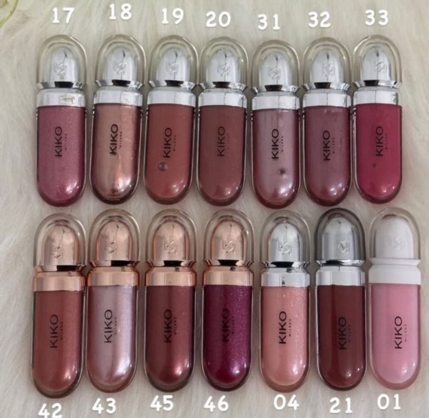KIKO markasının çok renkli, parlak ve canlı tonlarda ruju. Farklı görünümler için çeşitli renkler içerir.
