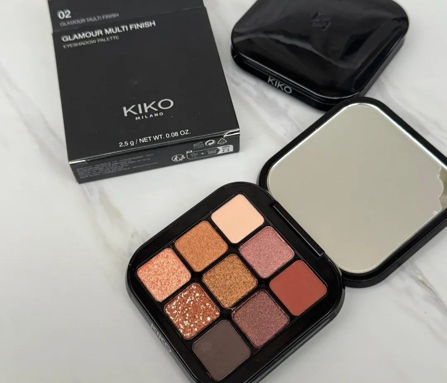 KIKO Milano göz farı paleti, bej ve koyu tonlarda dokuz renk içerir. Çeşitli bitişlere sahip, aynalı kompakt tasarım.