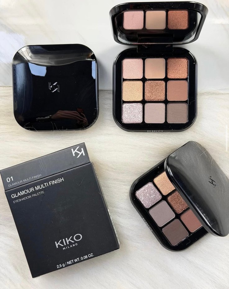 KIKO Glamour Multi Finish göz farı paleti, mat ve ışıltılı bitişleriyle bej ve koyu tonlarda çeşitli renkler sunar. ✨