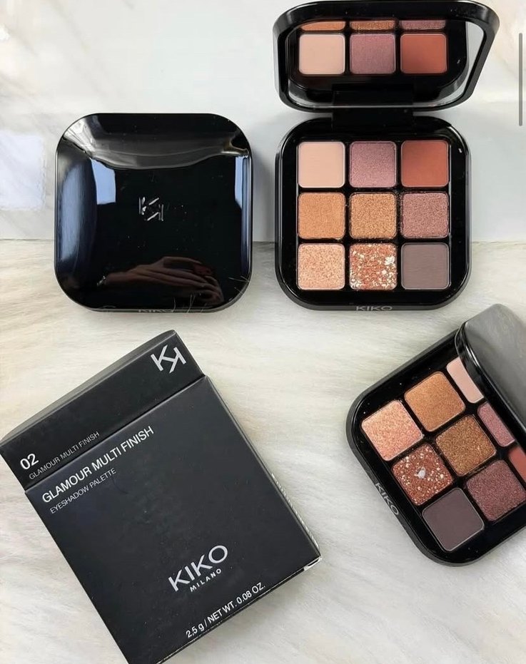 KIKO Glamour çoklu bitişli göz farı paleti, mat ve simli dokuda bej ve koyu canlı tonlar sunar. Çeşitli göz makyajları için uygundur.