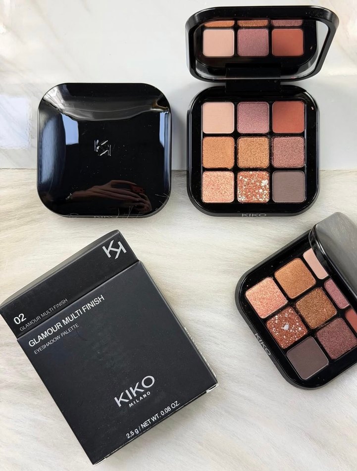 KIKO Glamour Multi Finish far paleti, mat ve ışıltılı bej ile koyu tonlardan oluşur. Kompakt siyah kutu ve aynalı tasarım içerir.