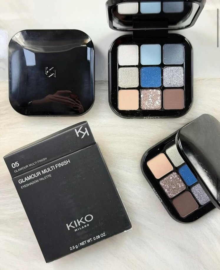 KIKO Glamour Multi Finish far paleti, çeşitli canlı koyu ve çok renkli tonlar içerir. Simli, mat ve ışıltılı bitişlerle zengin göz makyajı sağlar.