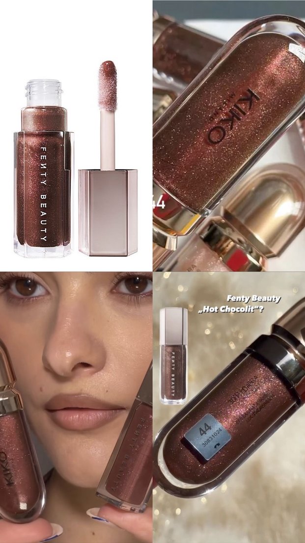 Fenty Beauty Hot Choclit, parlak kahverengi renkte, pürüzsüz dokulu bir dudak parlatıcısıdır kiko ile aynı renk olarak çıkartıldı Kolay kullanım için hassas aplikatöre sahiptir.