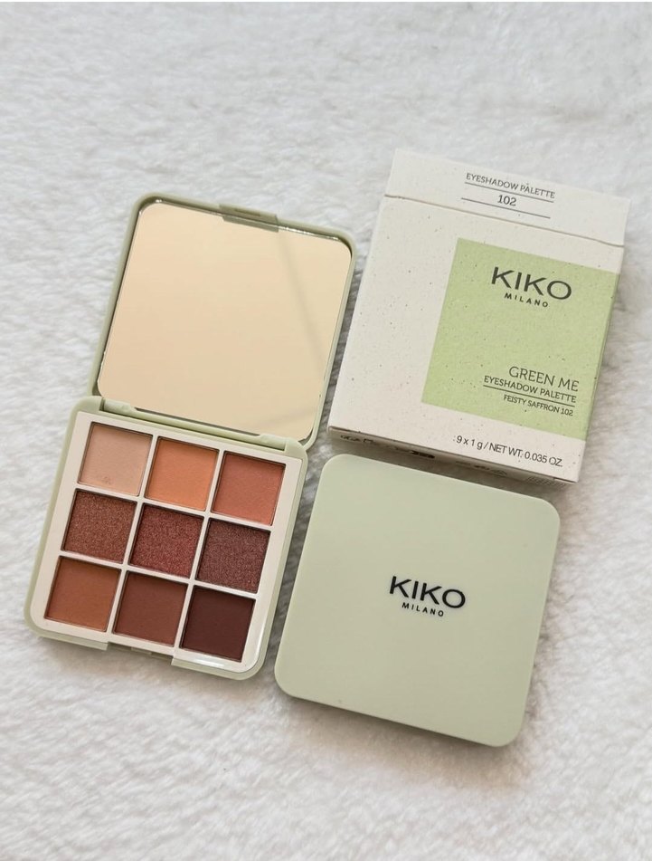 KIKO Green Me 102 göz farı paleti, açık bej ve kahverengi tonlarında 9 renkten oluşur. Kompakt tasarımda ayna bulunur.