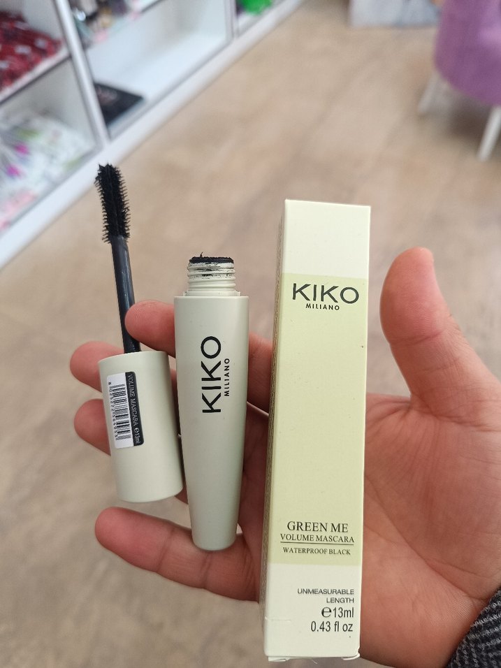 KIKO Green Me suya dayanıklı siyah maskara, kolay kullanımlı fırçasıyla hacim sağlar. 13 ml ürün, haki renk tüp ve kutuda sunulur.