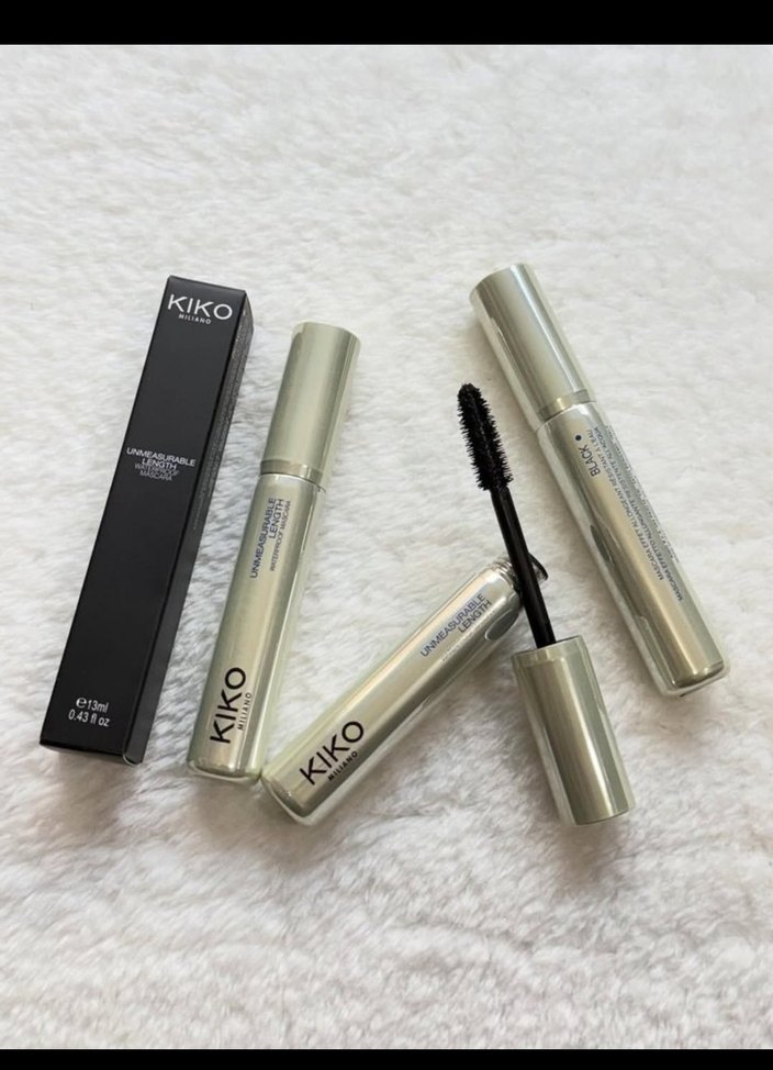 KIKO markalı gri renk maskara, bej tonlu ambalajda. Kirpiklere hacim ve belirginlik kazandırır.
