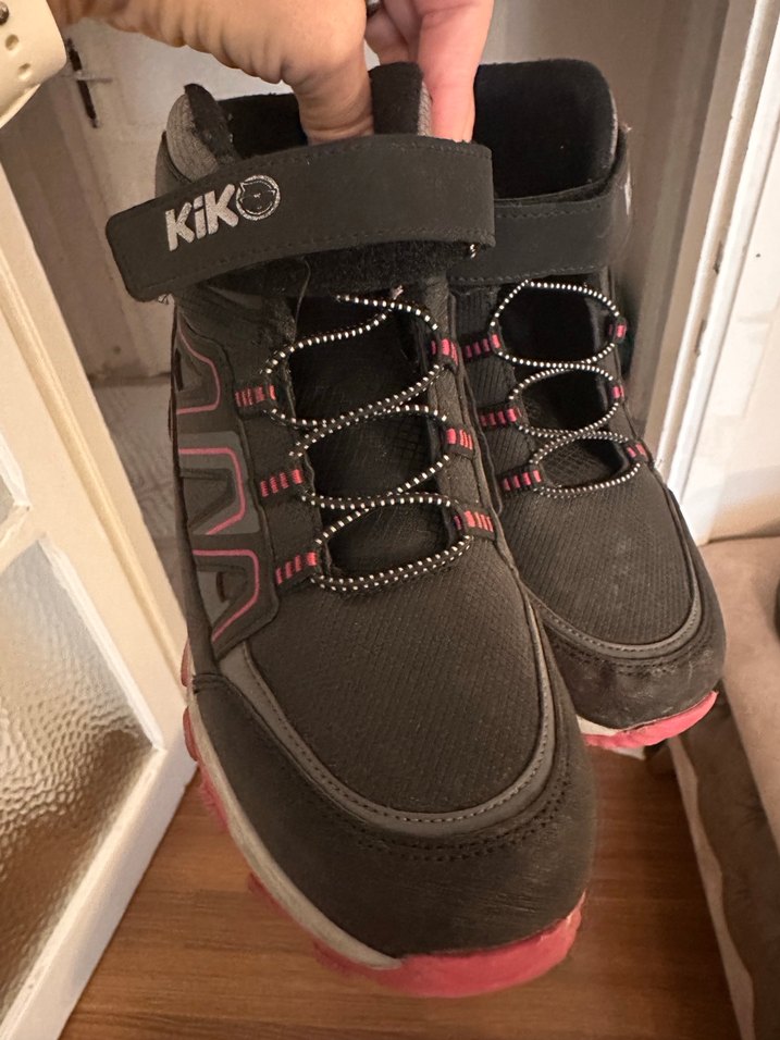 KIKO marka, koyu pembe baskılı, cırt cırtlı ve kauçuk tabanlı kız çocuk sneaker modeli, rock punk tarzını yansıtıyor.