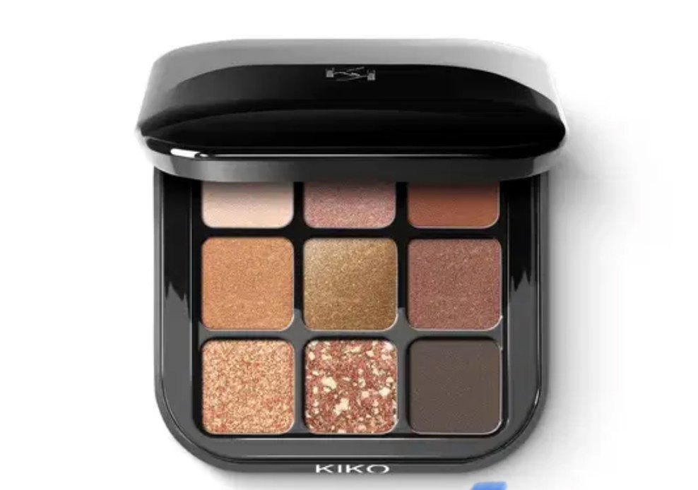 Kiko far paleti, mat ve ışıltılı krem kahve tonlarında dokuz renk içerir, çeşitli göz makyajı seçenekleri sunar.