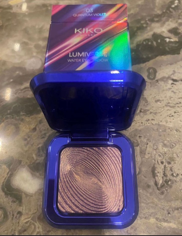 KIKO Lumiverse Quantum Violet göz farı, canlı ve koyu çok renkli bir tonu su bazlı formülle sunar, parlak bir görünüm sağlar.