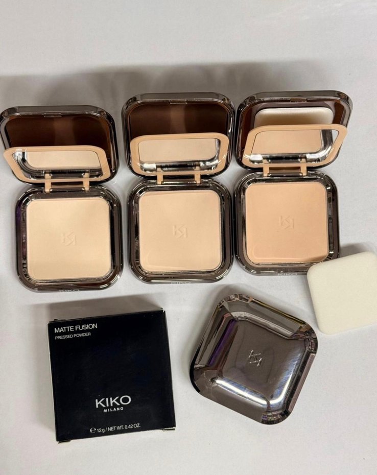 KIKO Mat Fusion preslenmiş pudra, açık bej tonlarında, pürüzsüz ve doğal bir görünüm sağlar. Kompakt kutu ve sünger aplikatör ile birlikte.