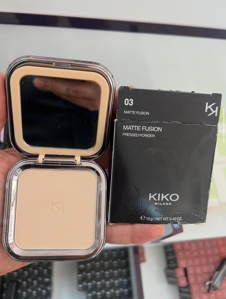 KIKO Matte Fusion 03 numara, açık bej tonunda, mat bitişli preslenmiş pudra. Kompakt kutusunda ayna bulunur.