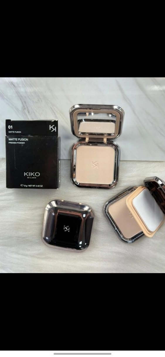 KIKO Matte Fusion preslenmiş pudra, hafif bej tonunda, doğal kapatıcılık ve mat bitiş sağlar. Aynalı ve aplikatörlü şık kompakt kutuda.