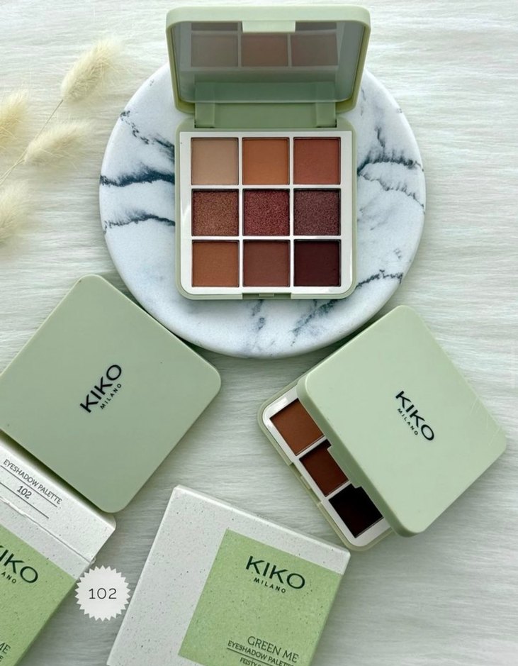 KIKO Milano 102 göz farı paleti, açık haki ve sıcak tonlarda dokuz renkten oluşur, mat ve ışıltılı dokularla çeşitli makyaj seçenekleri sunar.