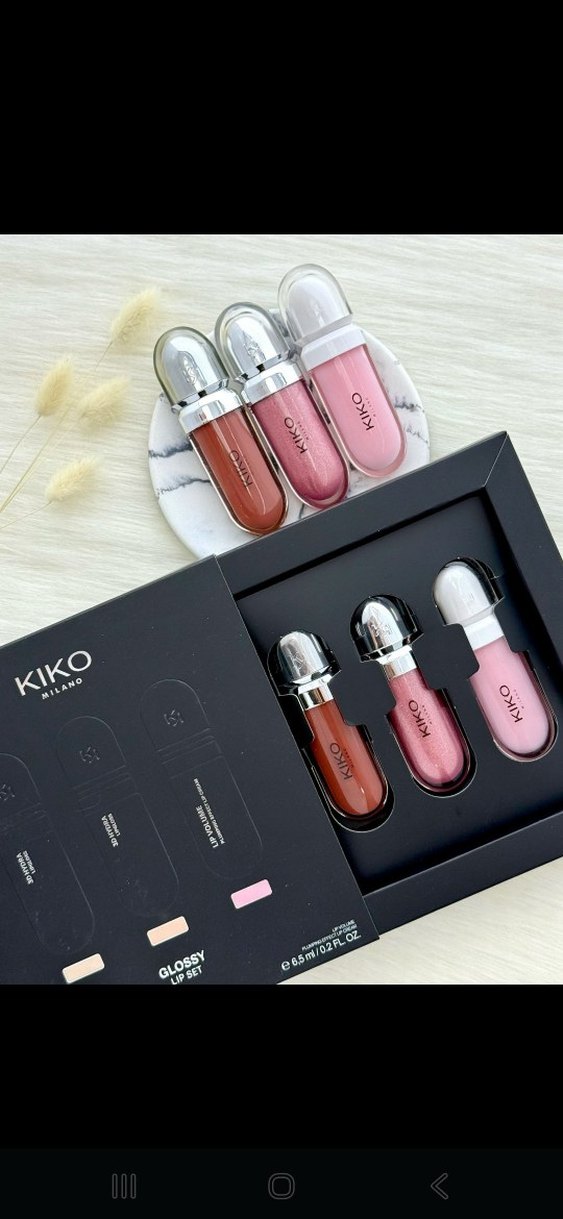 KIKO Milano parlak likit ruj seti, canlı ve açık pembe tonlarda üç renk içerir. Dudaklara parlaklık katar.