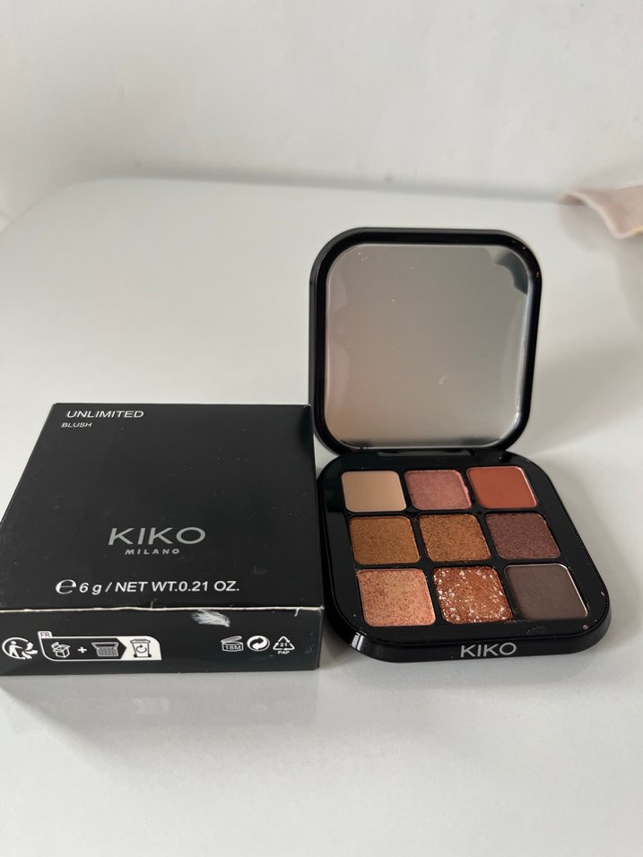 KIKO Milano 9'lu far paleti, mat ve simli bej ile koyu tonlarda renkler içerir. Toplam ağırlık 6g (0.21 oz).