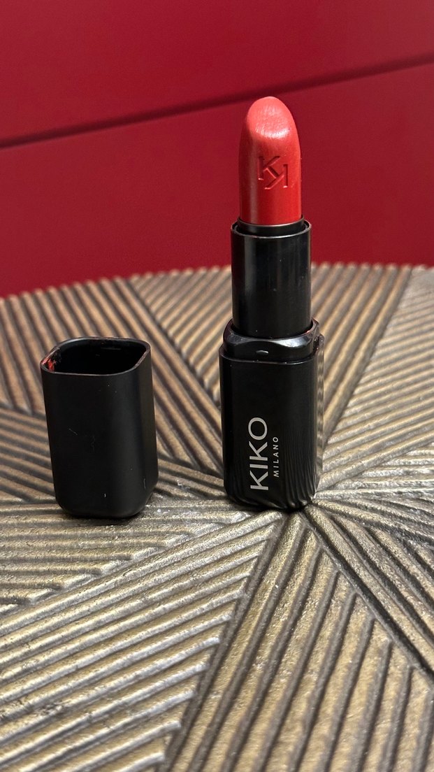 KIKO Milano markasına ait (Cherry Red)koyu kırmızı renkte, canlı renk veren ve pürüzsüz dokulu ruj. No: 416. Ürün orijinaldir. Kiko mağazasından alınmıştır.