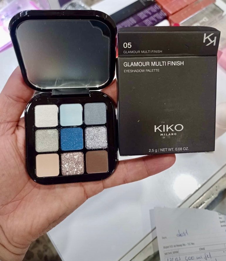 KIKO Milano Glamour Multi Finish göz farı paleti, çoklu bitişli dokuz canlı renkten oluşur ve 2,5g ürün içerir.
