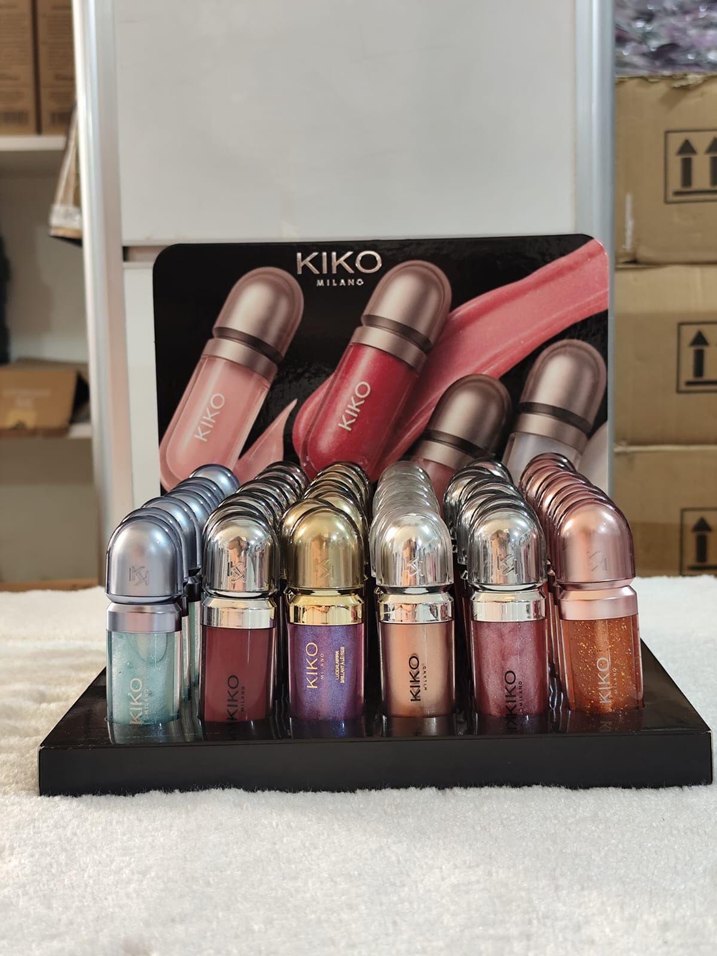 KIKO Milano'nın parlak bitişli, çeşitli açık ve canlı renklerde çok renkli ruj seti. Her ruj şık metalik kutuda sunuluyor.