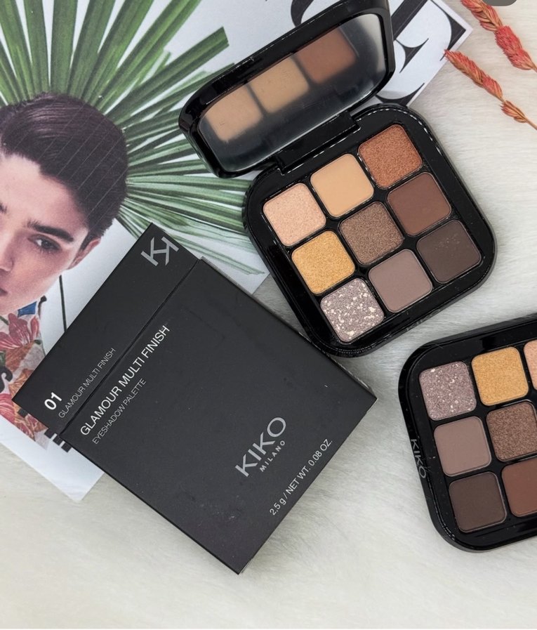 KIKO Milano Glamour Multi Finish far paleti, mat, ışıltılı ve simli dokularda koyu bej tonlarında renkler sunar.
