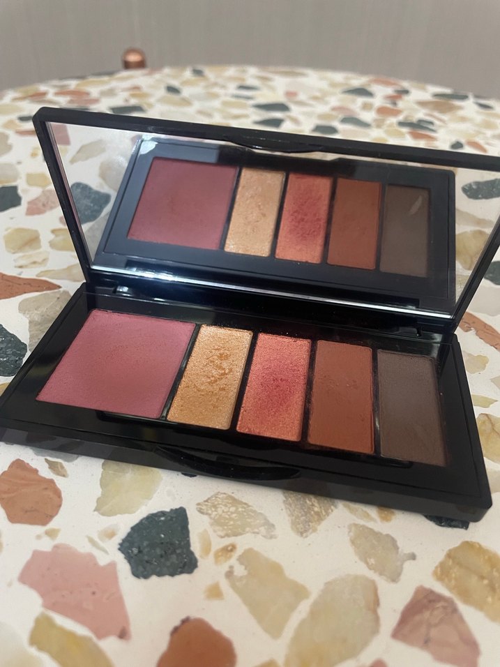 Mat ve ışıltılı bej tonlarında beş renkten oluşan göz farı paleti, kompakt kutuda ve aynalıdır.