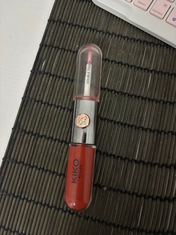 KIKO Milano çift taraflı ruj, koyu kırmızı renkte ve bir ucu şeffaf kapaklıdır. Ortasında metalik bir bant bulunur. Seffaf kismi bitik neredeyse diger tarafta da az var