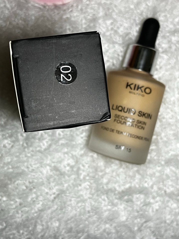 Kiko Milano Likit Skin fondöten, bej tonunda, doğal ikinci cilt görünümü sağlar ve SPF 15 koruma içerir. Damlatıcı uçlu şişede sunulur.