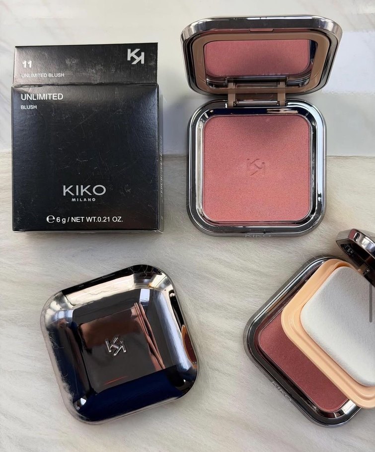 KIKO Milano pembe toz allık, 6 gram ağırlığında. Kompakt kutuda, sınırlı sayıda üretilmiş ve hafif, doğal bir görünüm sunar. Her rengi mevcut