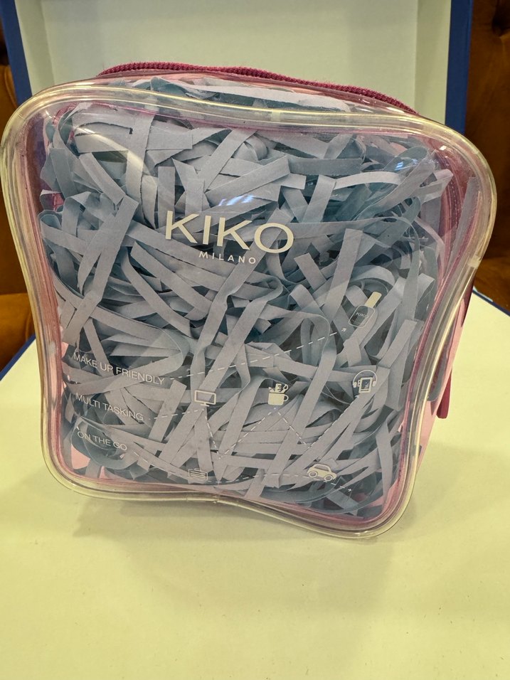 Kiko Milano markalı, pastel pembe renkte ve baskılı desenli plastik makyaj çantasıdır. Fermuarlı kapanışı ve minimalist tarzıyla günlük kullanım için uygundur.