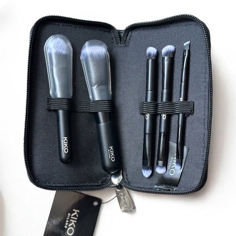 Kiko Milano marka, yumuşak kıllı siyah 5 makyaj fırçası, siyah fermuarlı kılıf içinde düzenli şekilde saklanır. ️