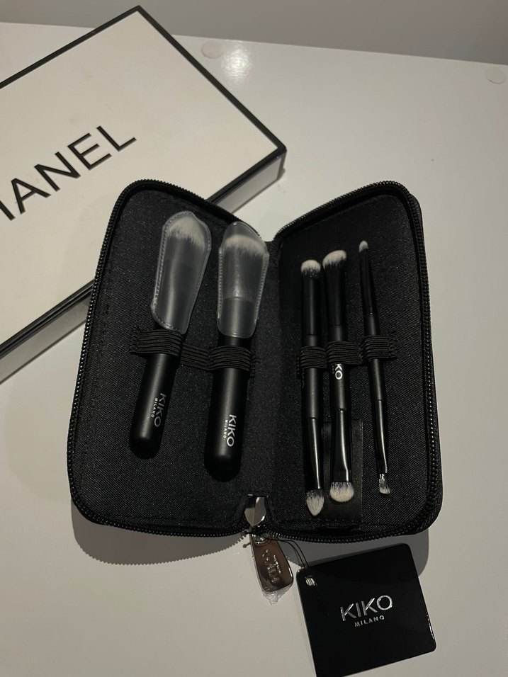 KIKO Milano'nun siyah makyaj fırçası seti, beş yumuşak kıllı fırça ve koruyucu kılıf içerir, hassas uygulama sağlar. ️