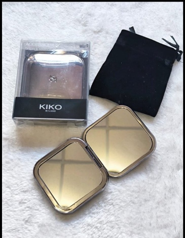 KIKO markasına ait parlak altın renkli göz farı paleti, aynalı şık kompakt ve siyah kese ile birlikte. ✨